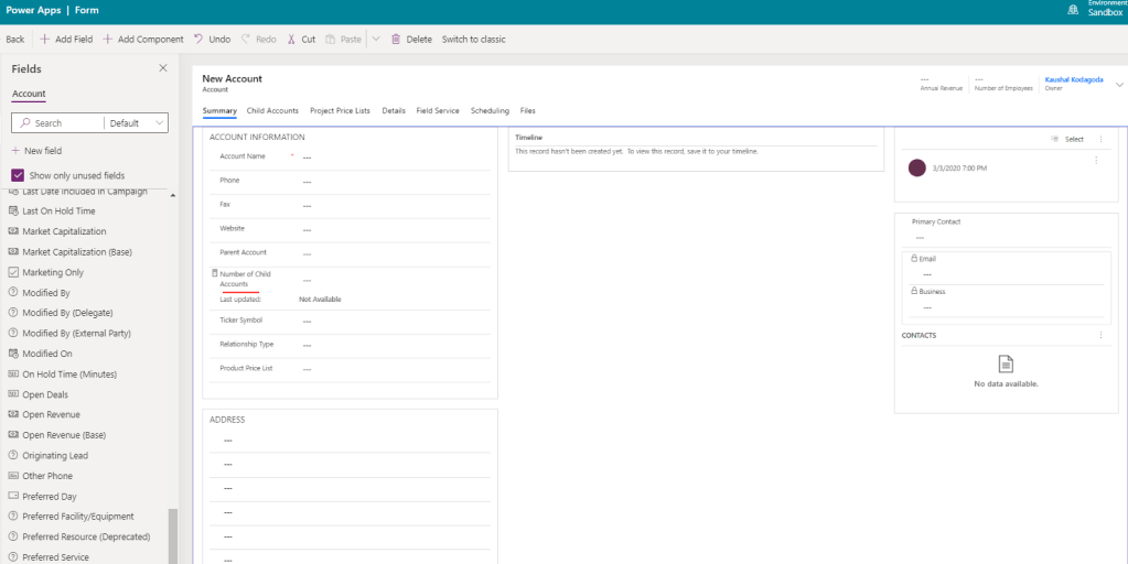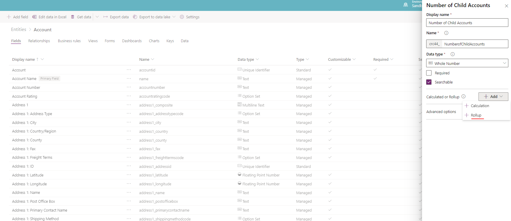 - Click “Add field” and add ” Number of Child Accounts” whole number field