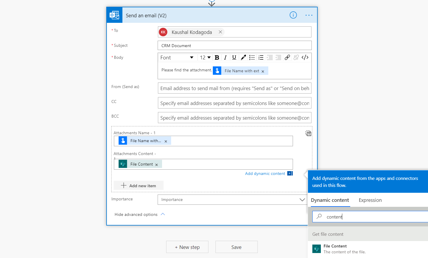 8. Finally, let’s add an email action to send the file as an attachment. We can use the file name as the attachment name. Attachment content should be the output of “Get content” action.
