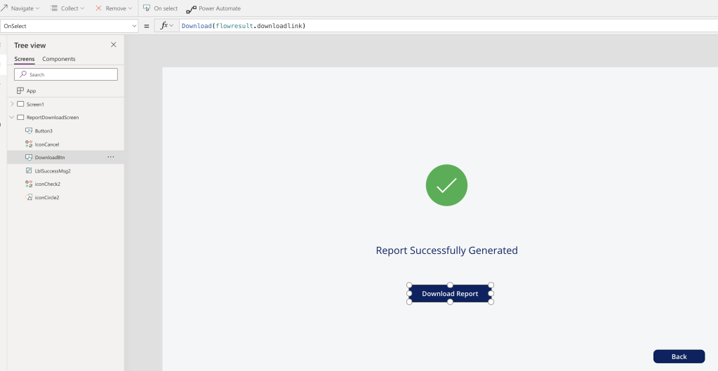 c. Since we are passing the downloadlink from flow, we can access it inside the canvas app using flowresult object.