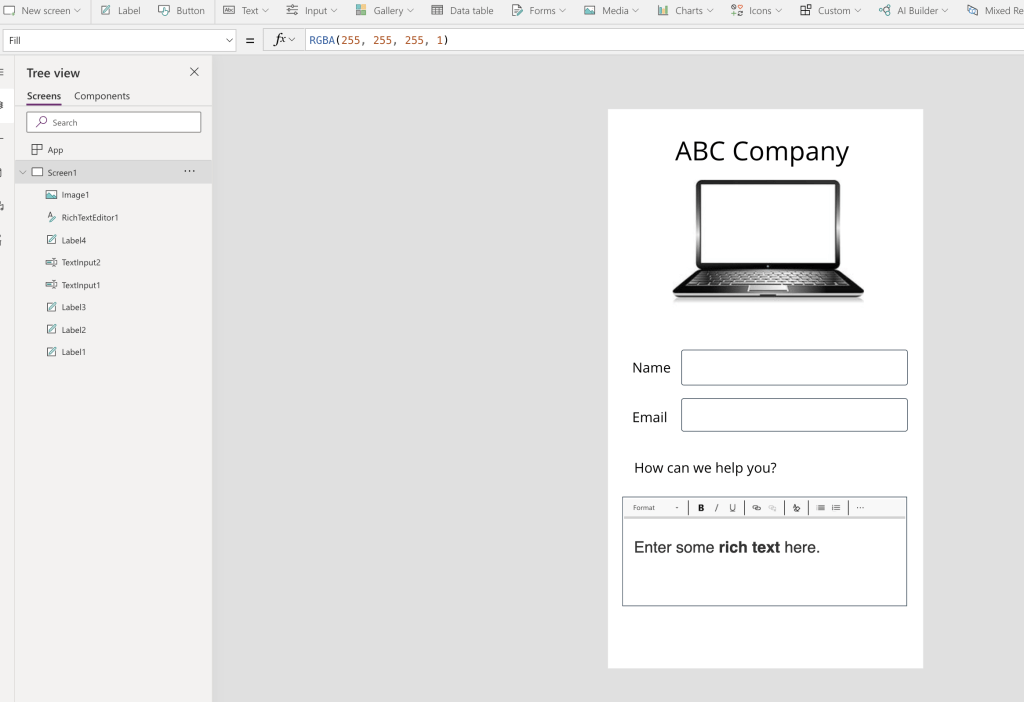 3. Finally, we need to update the RichTextEditor1 field with the text that was entered in the expanded view. For this, we can set the default value of the RichTextEditor1 as the HtmlText value of RichTextEditor2 field.