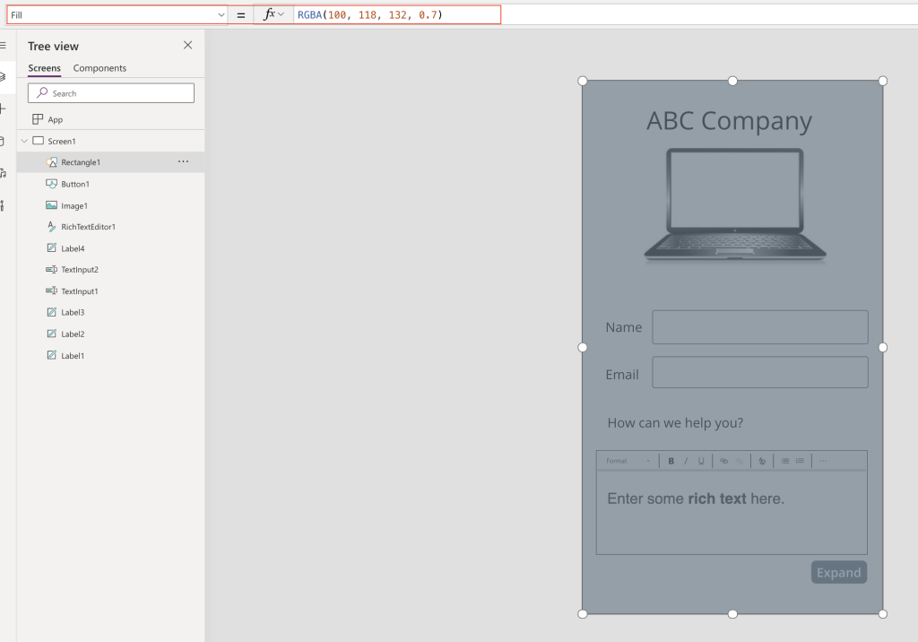 Finally, when the application is loading, Visible attribute should be “false” so that the modal box won’t appear unless the “Expand” button is clicked.
