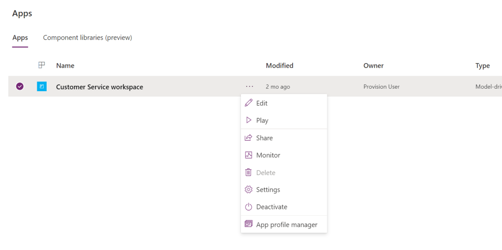 - Click on ellipses next to “Customer Service Workspace” and select “App profile manager”